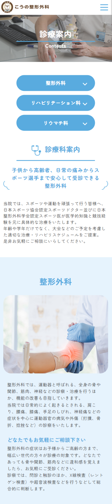 清潔感のあるブルーを基調とし、整形外科・リハビリ科・リウマチ科と幅広い診療内容を分かりやすくカテゴリー分けをしました。また、再診の方が予約しやすいように予約バナーを固定で表示しております。