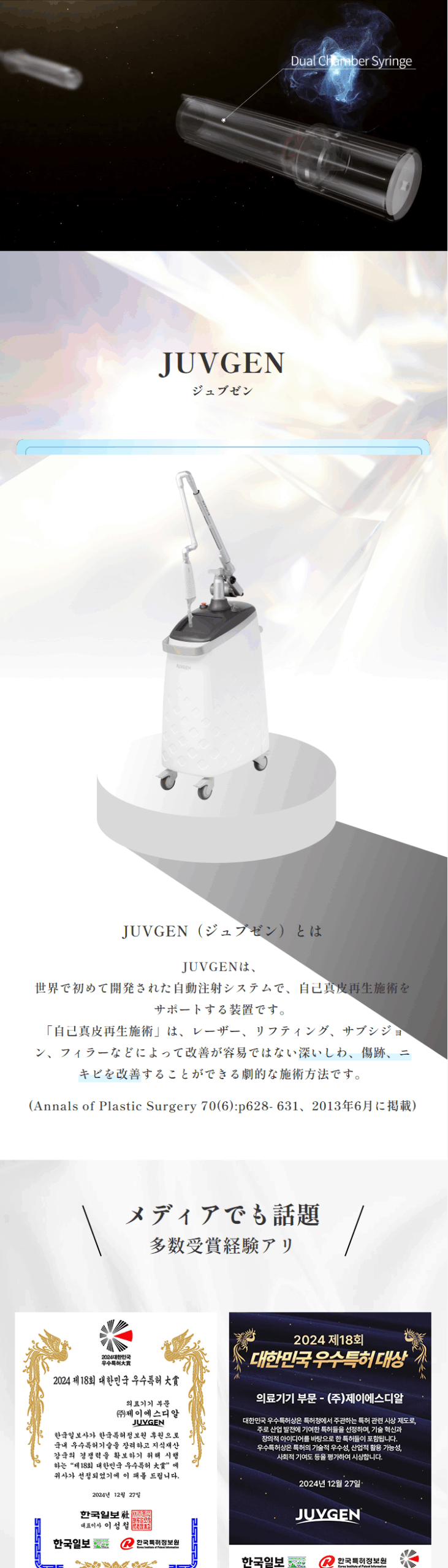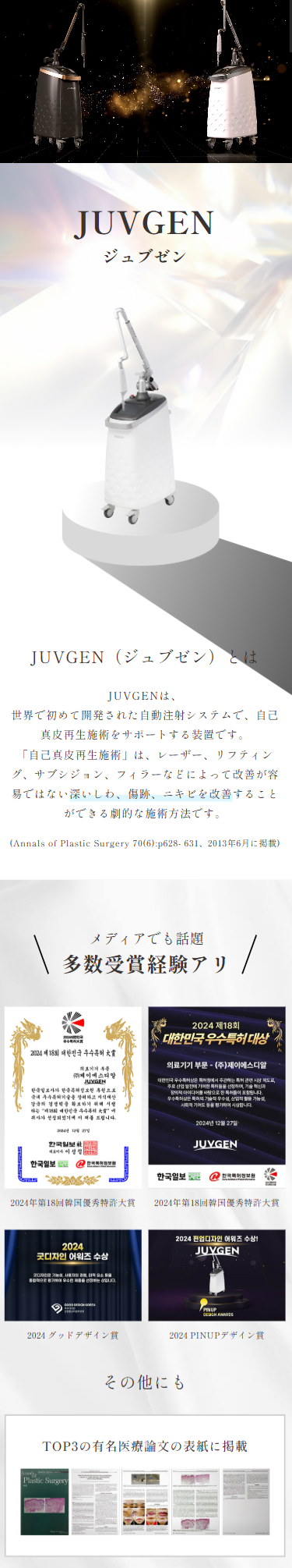 ジュブゼン(JUVGEN)とは、世界で初めて開発された自動注射システムで、自己真皮再生施術をサポートする装置です。「自己真皮再生施術」は、レーザー、リフティング、サブシジョン、フィラーなどによって改善が容易ではない深いしわ、傷跡、ニキビを改善することができる劇的な施術方法です。