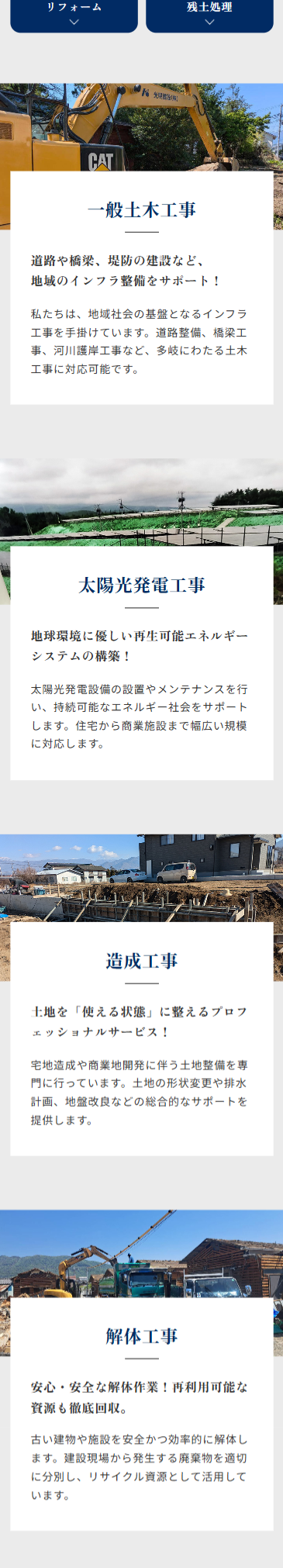インパクトのあるメインビジュアルと、落ち着いた雰囲気の色使いで、信頼される総合建設会社であることを表現しました。