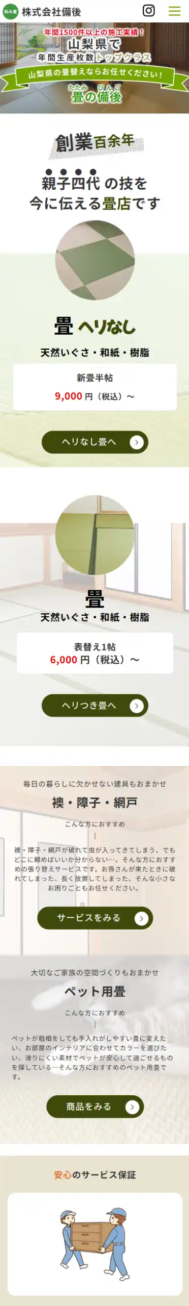 備後様は、創業100年以上続く畳屋さんで、一般のご家庭から宿泊施設まで、幅広く畳の新調や張替え、オリジナルの畳制作などを行っております。また対象地域が、山梨県全域から近隣県までと幅広く、緊急の際もお電話一本で、臨機応変に対応してくださるところが魅力の一つです。畳の種類が豊富ですので、どなたがご覧になっても分かりやすい設計と親しみやすさを大切にしました。