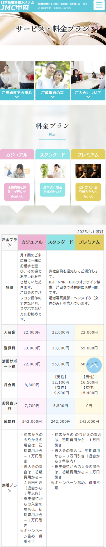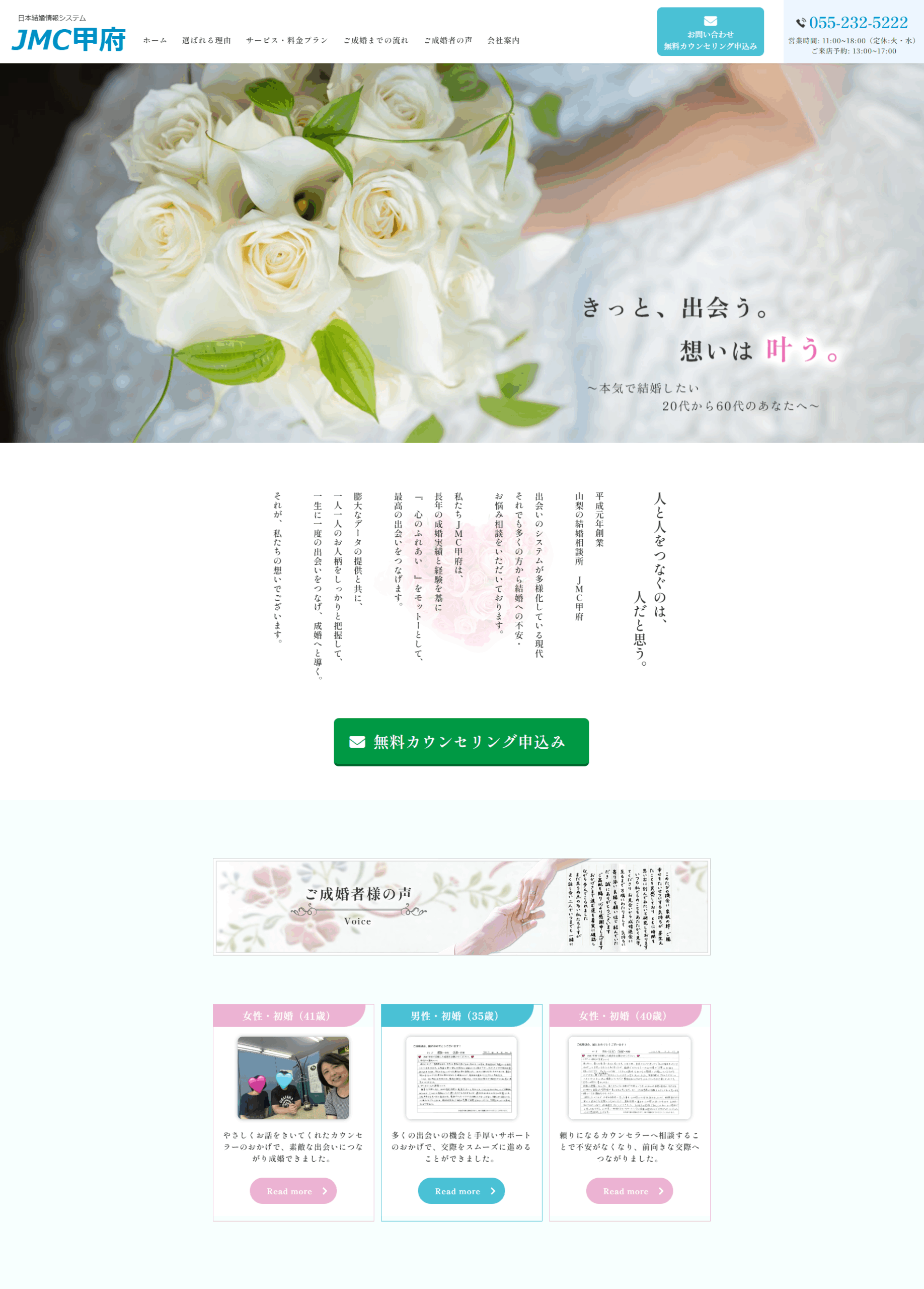 山梨県甲府市にございます結婚相談所【日本結婚情報システム JMC甲府様】のホームページを制作させていただきました。