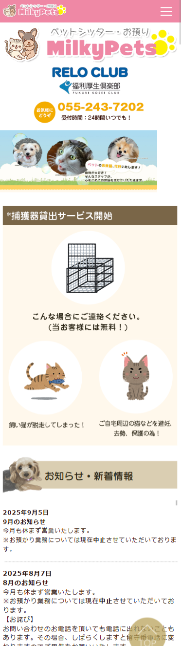 山梨県甲府市のペットシッター【MilkyPets(ミルキーペッツ)様】のホームページを制作させていただきました。