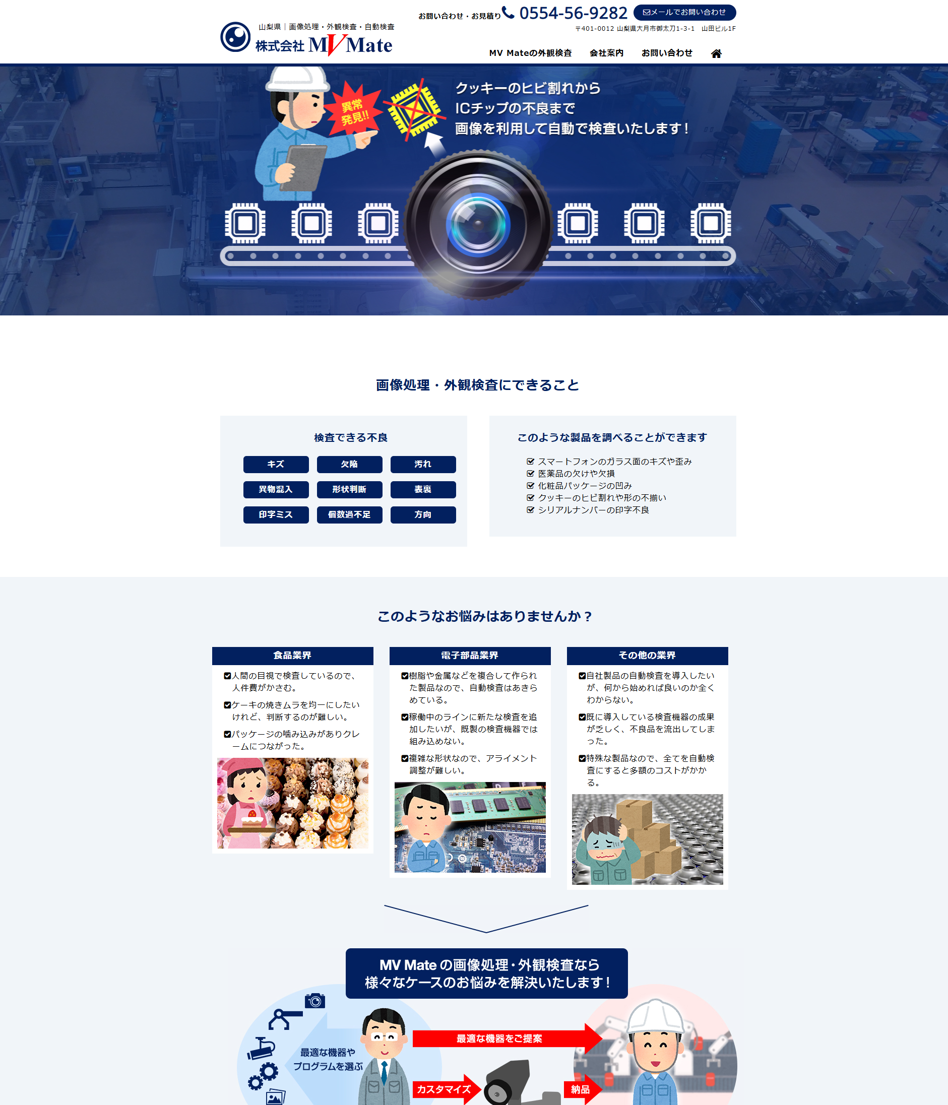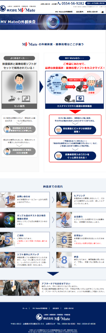 山梨県大月市で主に 自動検査・画像処理・外観検査 の分野を手がけている【株式会社MV Mate様】のホームページを制作させていただきました。