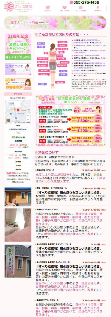 山梨県甲斐市にある女性専門整体院【さわ治施院様】のホームページを制作させていただきました。