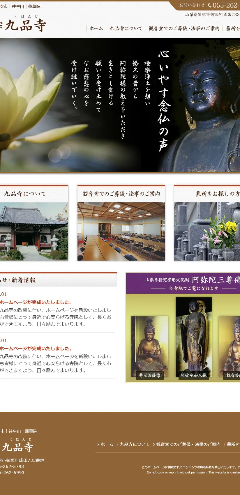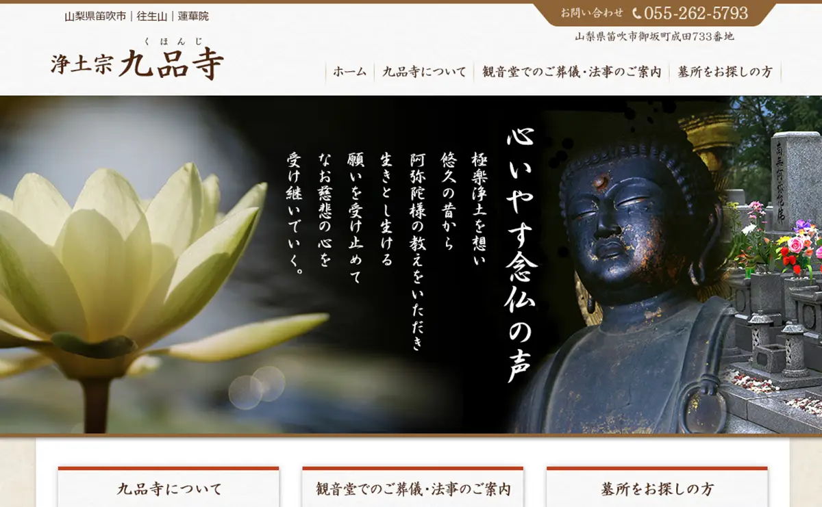 山梨県笛吹市にある浄土宗寺院「九品寺」様のホームページ制作を担当しました。悠久の歴史と阿弥陀様の教えを大切に受け継いできた寺院の想いが、静かに、そしてやさしく伝わるデザインと構成を意識しています。