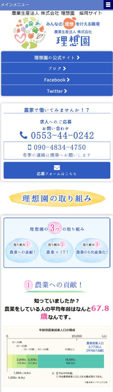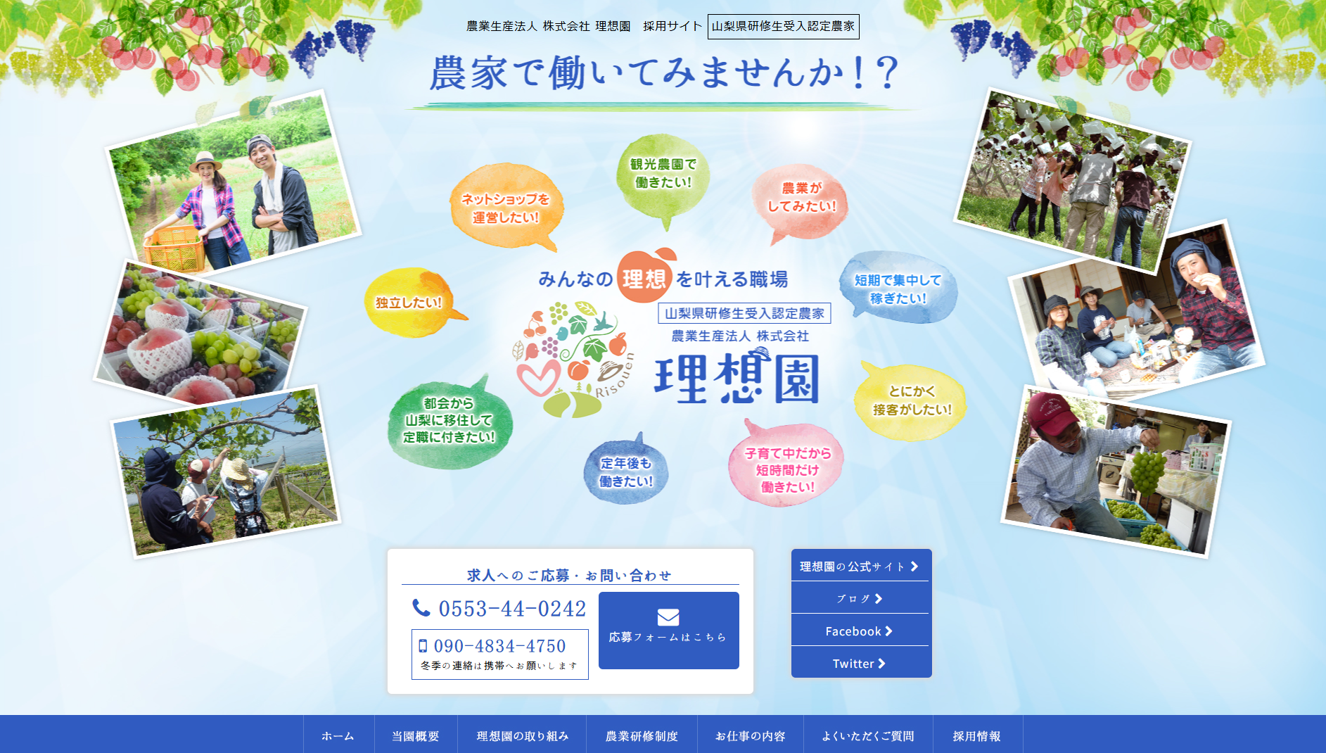 山梨県甲州市の果樹農家【桃と葡萄の専門店・理想園の採用サイト様】のホームページを制作させていただきました。