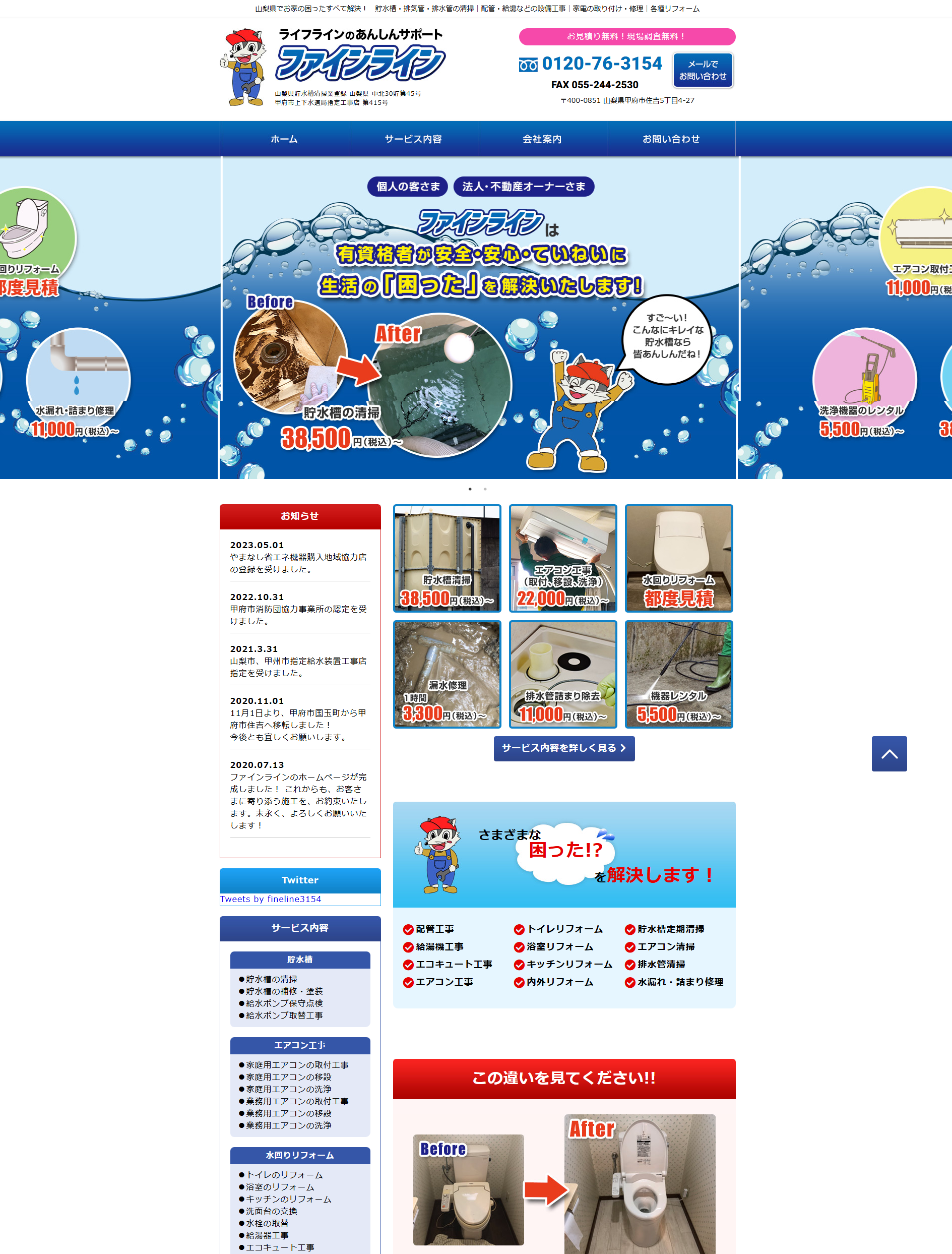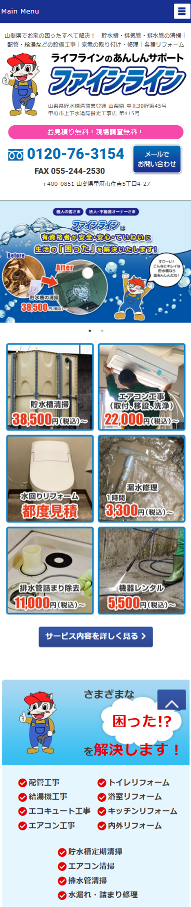 山梨県甲府市で貯水槽・排気管・排水管の清掃を行う【ファインライン様】のホームページを制作させていただきました。