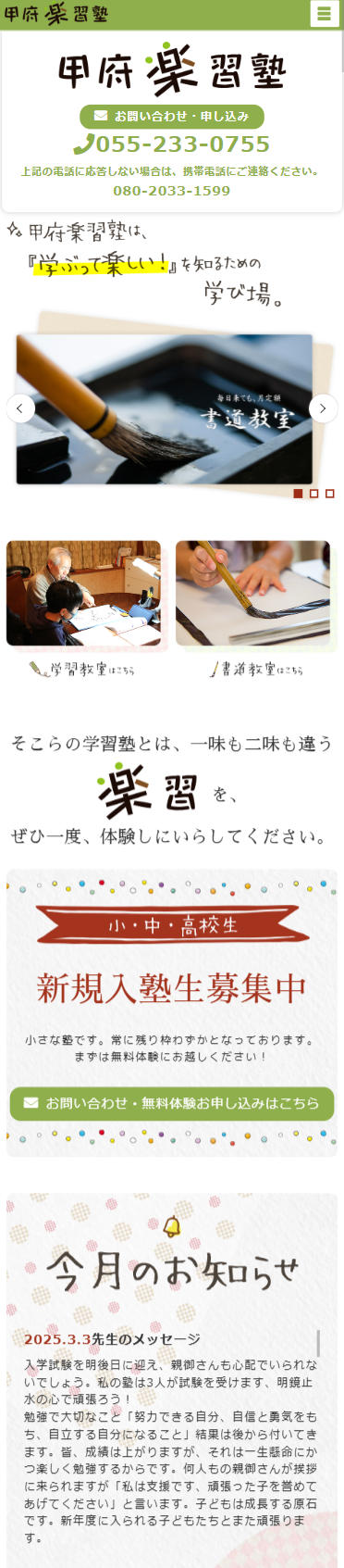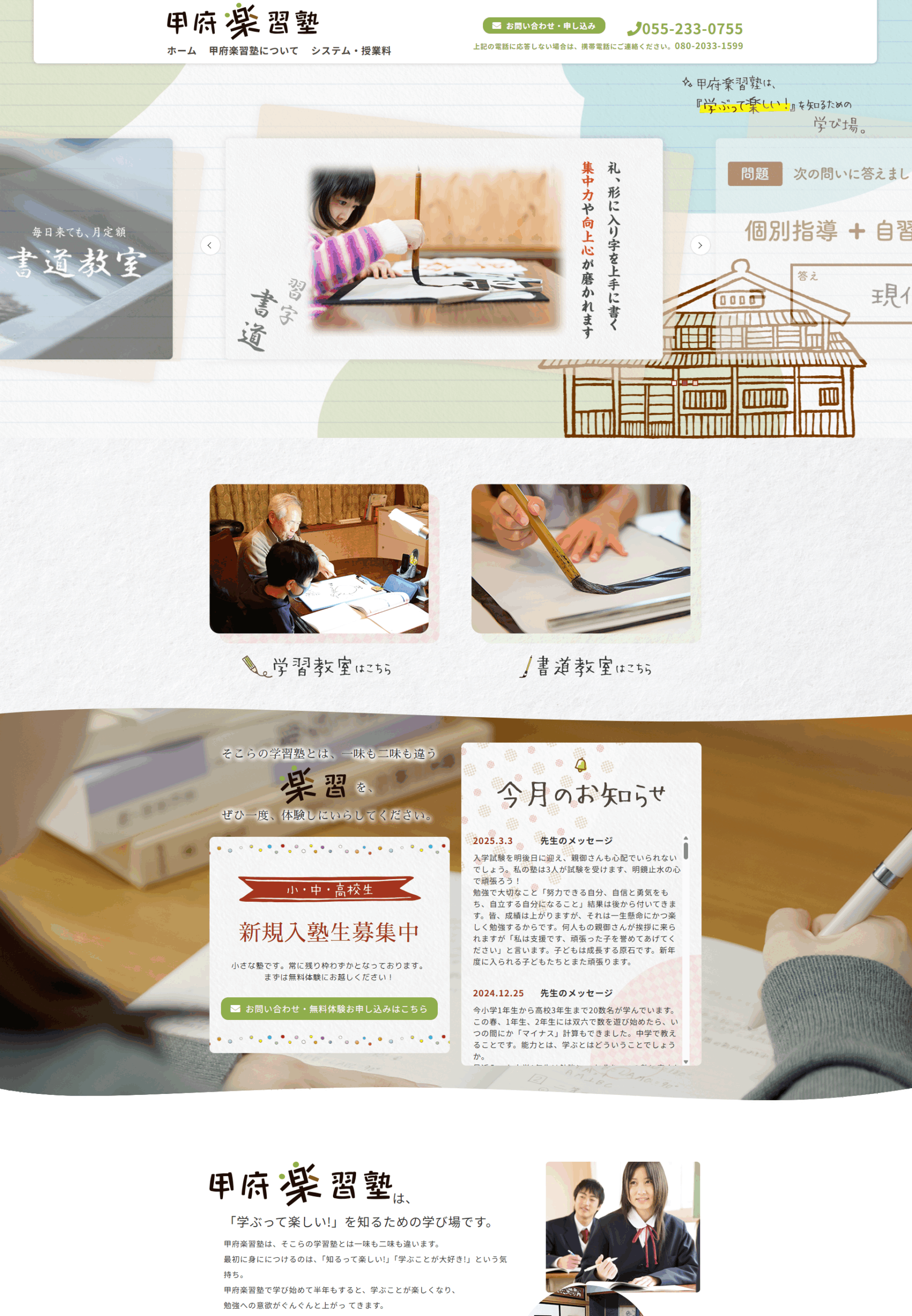 山梨県甲府市にある学習塾【甲府楽習塾様】のホームページを制作させていただきました。