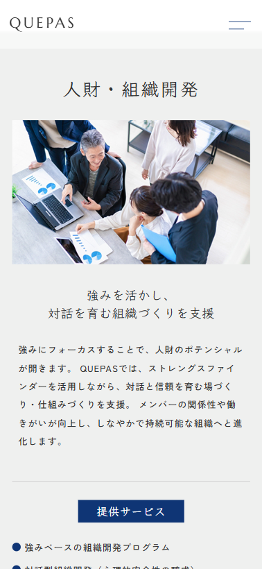 QUEPAS合同会社様は、組織開発、リーダーシップ開発、コーチングなど「自分らしさ」を起点として、個人が自分の価値観や強みを自覚し、そのことを活かして前に進むことを支援する会社です。個人の強みに着目するアプローチ(ストレングスファインダーなど)を重視していることも特徴のひとつです。